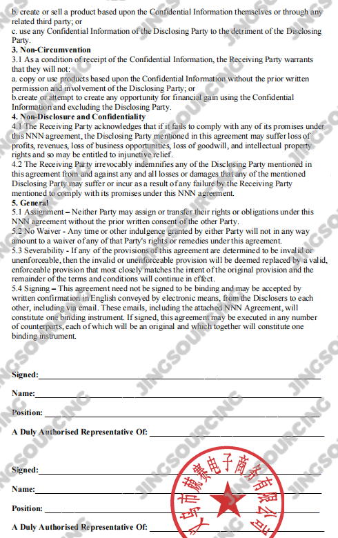 Some buyers, in particular big buyers, worry that cooperative partners or suppliers in China would disclose anything related to their business, such as the selling price and sales channels of products. This is another reason why an NNN agreement is requested. It binds suppliers not to disclose any shared business information.